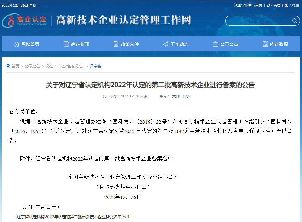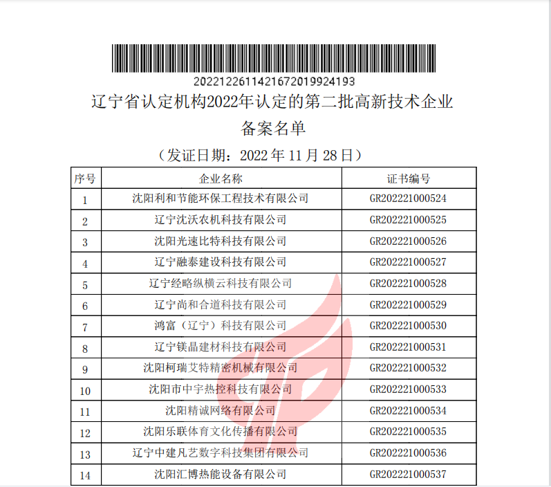 2022年12月26日,全國高新技術(shù)企業(yè)認(rèn)定管理工作領(lǐng)導(dǎo)小組辦公室正式發(fā)函,公布了遼寧省2022年認(rèn)定的第二批高新技術(shù)企業(yè)備案名單。沈陽市萬德富科技有限公司成功通過國家高新技術(shù)企業(yè)認(rèn)定。